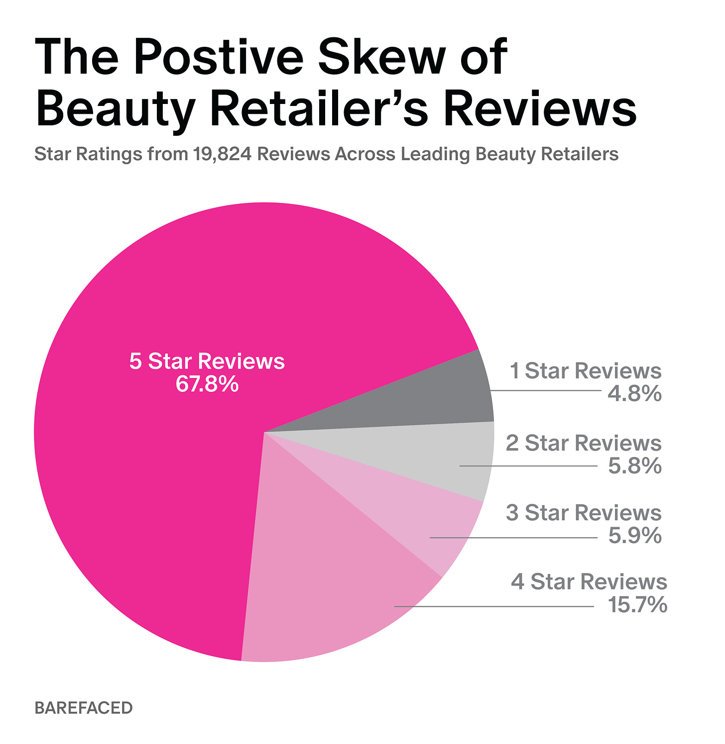 Firstly, it’s worth noting that retailer reviews skew excessively positive, with nearly 68% having a five star rating. This reflects what many beauty consumers already know: retail-hosted reviews are curated to drive conversion, rather than to assist shoppers in finding the best products.
